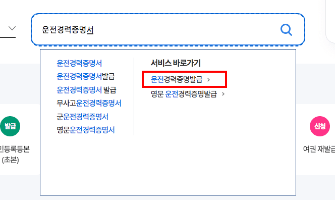정부 24 홈페이지에 도착하시면 위와 같은 메인 화면을 보게 됩니다. 입력창에 [운전경력증명서]를 입력하시고 아래 서비스 바로가기에서 운전경력증명발급을 선택합니다.