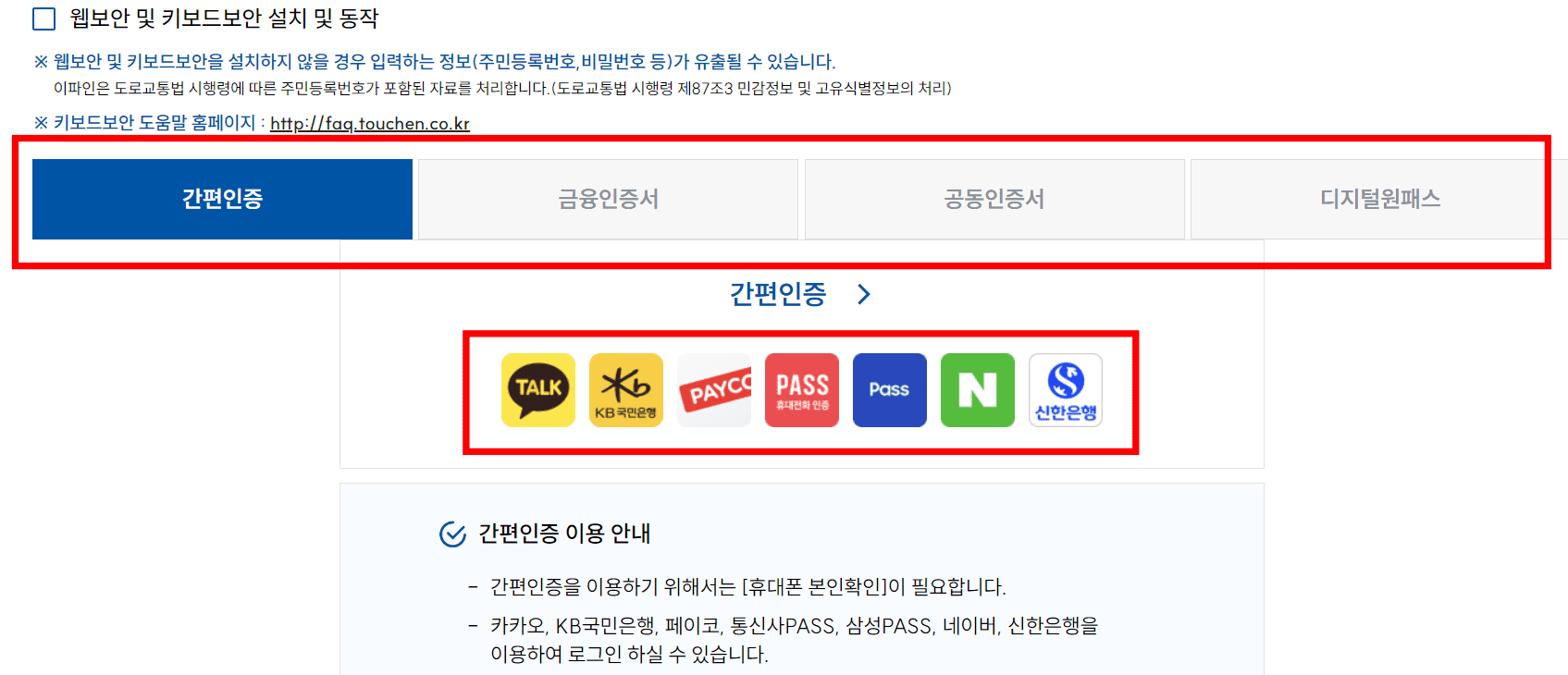 운전면허 취득일자 조회를 위해서는 로그인이 필요합니다. 간편 인증, 금융인증서, 공동인증서, 디지털원패스 중 보유한 인증 수단을 선택합니다. 여기에서는 간편 인증으로 진행해 보았습니다. 좌측에서 보유한 민간 인증서를 선택하고 우측에서 이름, 주민등록번호, 휴대폰 번호를 입력한 후 서비스 이용에 대한 전체동의 체크 후 하단의 인증요청 버튼을 클릭합니다.