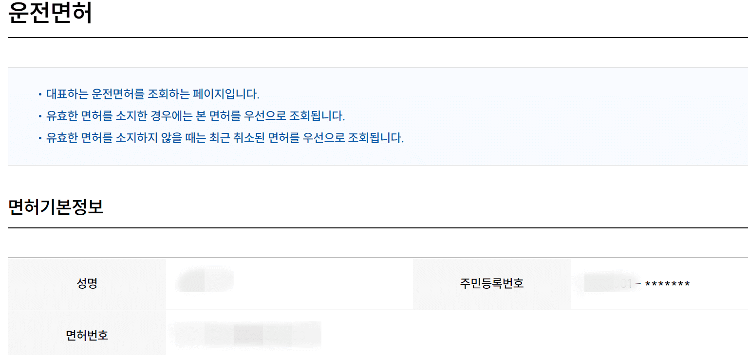 스마트폰에서 인증절차를 완료하고 PC로 돌아와 인증완료 버튼을 클릭합니다. 인증이 완료되면 보유한 운전면허의 정보 페이지가 표시됩니다. 스크롤을 제일 아래로 내리면 면허기본정보에서 발급일자를 확인할 수 있으니 직접 확인해 보시기 바랍니다.