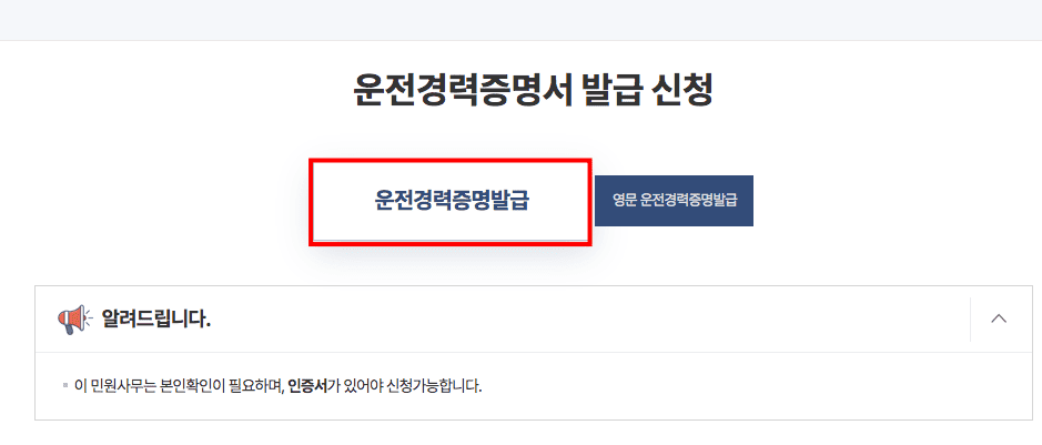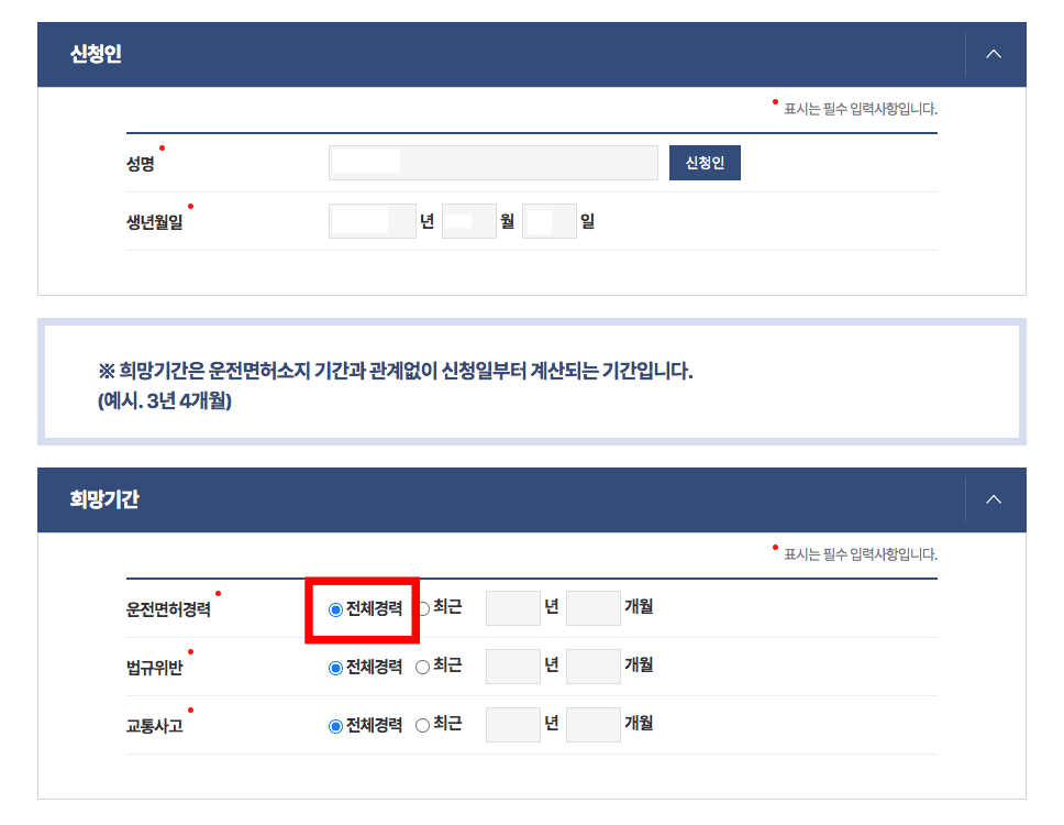 운전경력증명서 발급 신청 페이지가 표시됩니다. 운전면허 경력을 전체경력으로 체크합니다. 이후 발급 사유를 운전면허 취득일자 조회로 입력한 후 하단의 [민원신청하기] 버튼을 클릭합니다.
