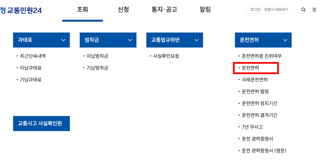 이파인 홈페이지에 방문하시면 위와 같은 메인 페이지를 확인할 수 있습니다. 상단 메뉴 조회로 마우스를 옮깁니다. 하단에 세부 메뉴가 보이면 운전면허 > 운전면허 메뉴를 선택합니다.