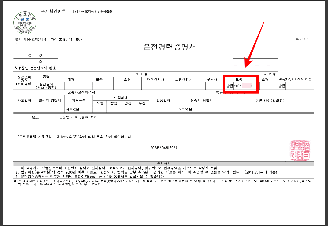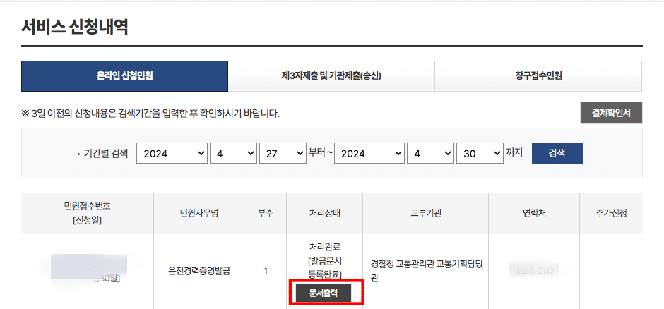 모든 인증이 완료되었으면 서비스 신청내역에서 문서출력이 가능합니다. 문서출력 버튼을 선택합니다. 운전경력증명서를 확인하시면 발급일자를 확인할 수 있습니다.