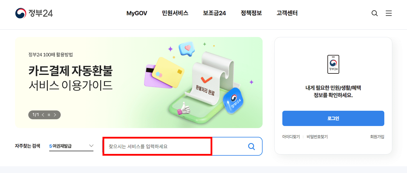 정부24는 정부의 민원 서비스, 정부혜택(보조금24), 정책정보/기관정보 등을 한 곳에서 한 눈에 찾을 수 있고 각 기관의 주요 서비스를 신청·조회·발급할 수 있는 대한민국 정부 대표 포털입니다
