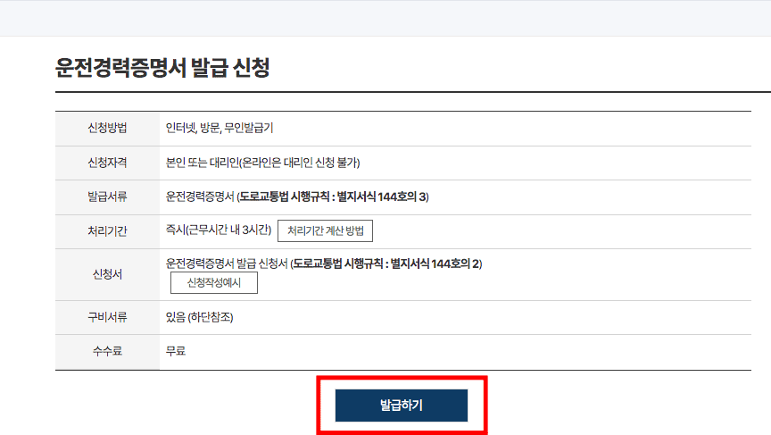 운전경력증명서 발급 신청 페이지가 표시되면 하단의 발급하기 버튼을 클릭합니다. 회원 또는 비회원 신청하기를 선택합니다. 비회원 신청의 경우 개인 정보 이용 동의를 체크하고 하단에서 이름, 주민등록번호, 입력확인 숫자를 입력하고 아래의 하단 버튼을 선택합니다.