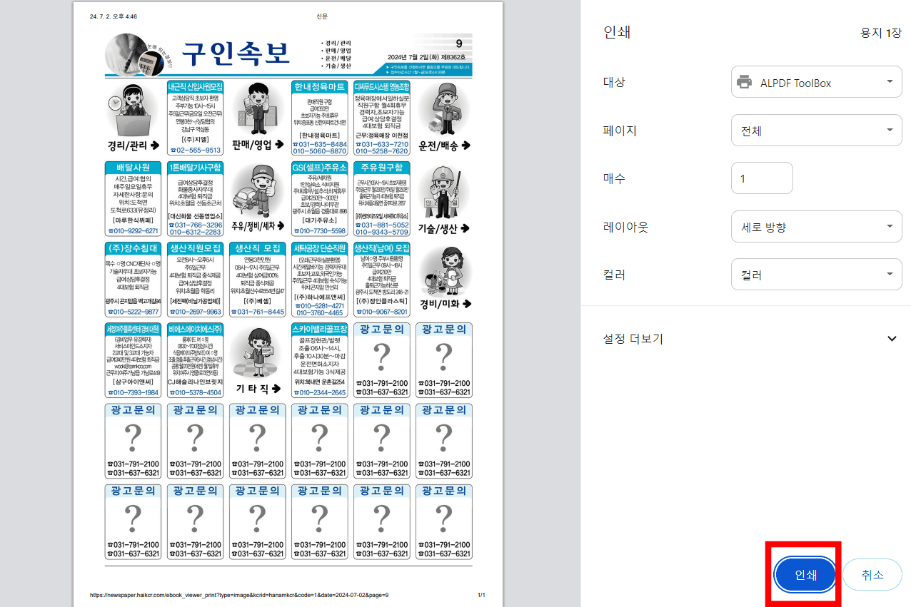 구인구직 정보 페이지가 표시되면 다양한 일자리 정보를 확인할 수 있습니다. 다만, 구인정보 글씨가 너무 작아서 안 보인다면 우측 상단의 [인쇄] 버튼을 클릭해 보시기 바랍니다. 이후 인쇄할 페이지를 선택합니다. 인쇄 설정 페이지에서 하단의 인쇄 버튼을 클릭하면 인쇄가 시작되며 꼭 인쇄를 하지 않아도 새창이 열리며 아주 큰 이미지가 보이게 되니 한번 이용해 보시기 바랍니다.