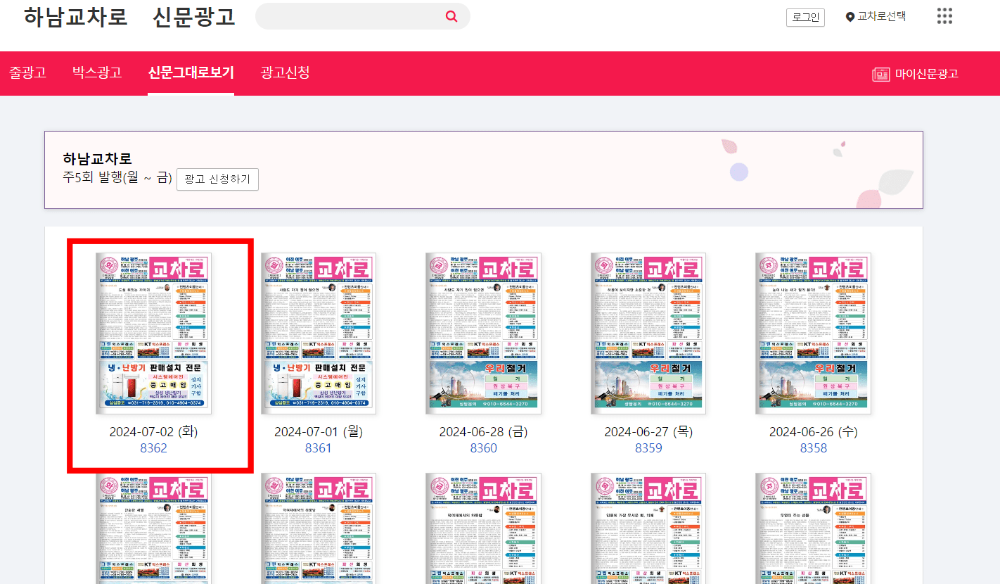하남교차로 신문그래로보기 페이지가 표시되면 원하는 회차의 교차로 신문을 선택합니다. PC 화면에 교차로가 표시되면 마우스를 클릭하여 실제 신문처럼 넘겨볼 수 있습니다. 구인구직 정보를 빠르게 보고 싶으시다면 좌측 메뉴에서 [구인/구직] 메뉴를 마우스로 클릭합니다.