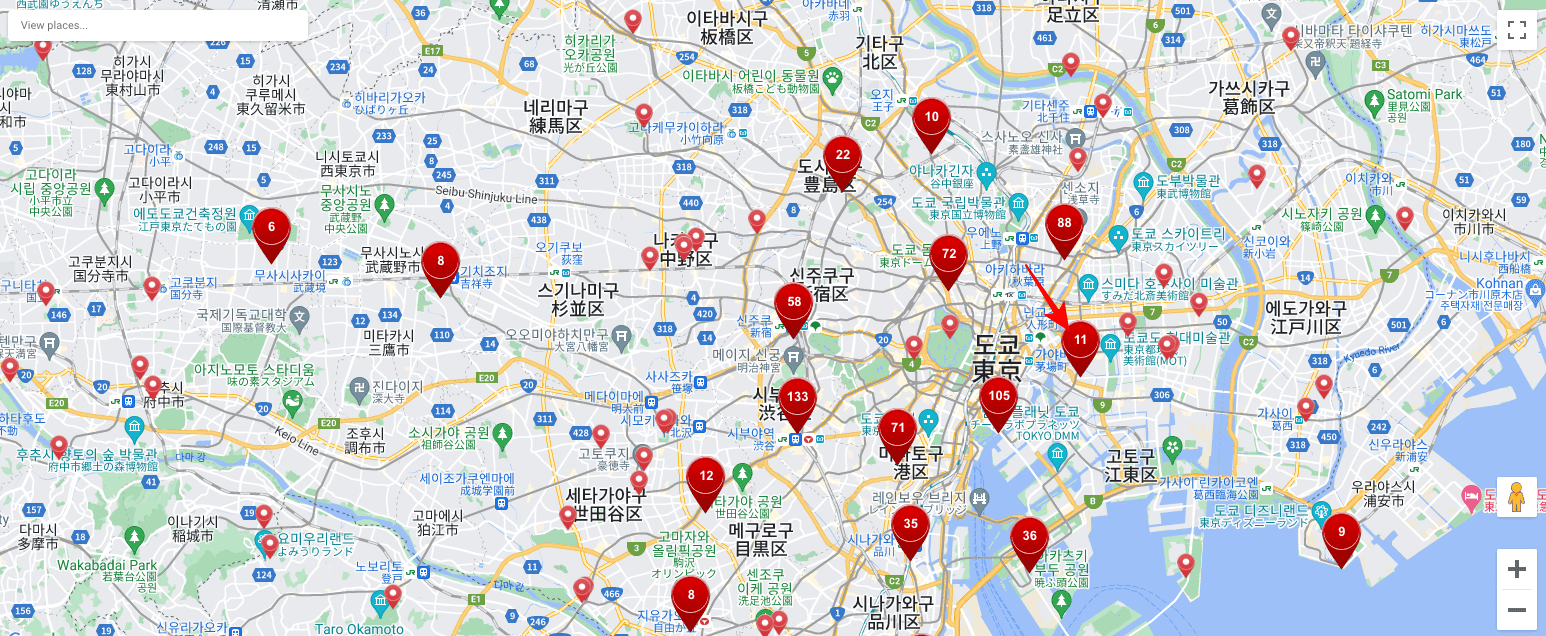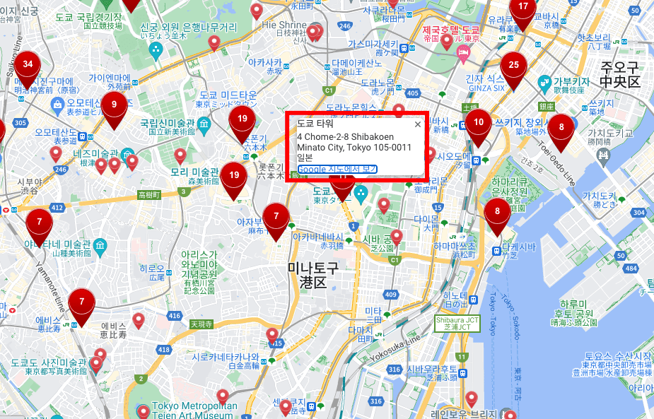 이 사이트가 유용한 것은 관광명소를 붉은색 마크로 표시한 것입니다. 도쿄에서 가장 유명한 명소를 찾아보시려면 숫자가 낮은 마크를 클릭해 보는 것입니다. 먼저 11번을 클릭해 보겠습니다. 11번은 바로 도쿄 타워였습니다. 구글 지도에서 보기를 선택하면 자세한 위치가 안내됩니다.