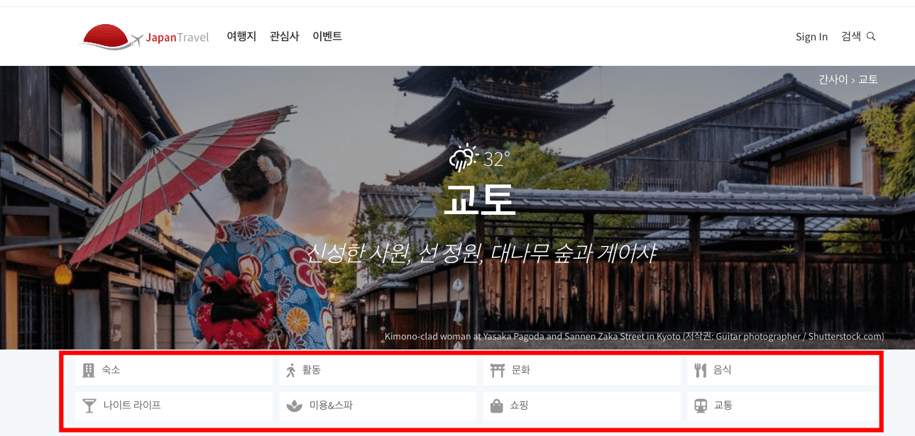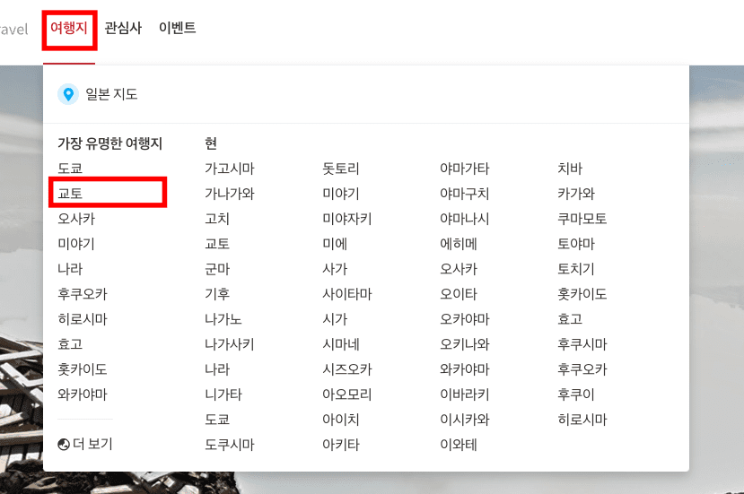 Japan Travel에서는 일본 지도 크게보기 검색 이외에도 현지 사람들이 전하는 다양한 관광 정보 확인이 가능합니다. 상단 여행지 메뉴 하단의 세부 지역을 선택합니다. 여기에서는 교토를 선택해 보겠습니다.