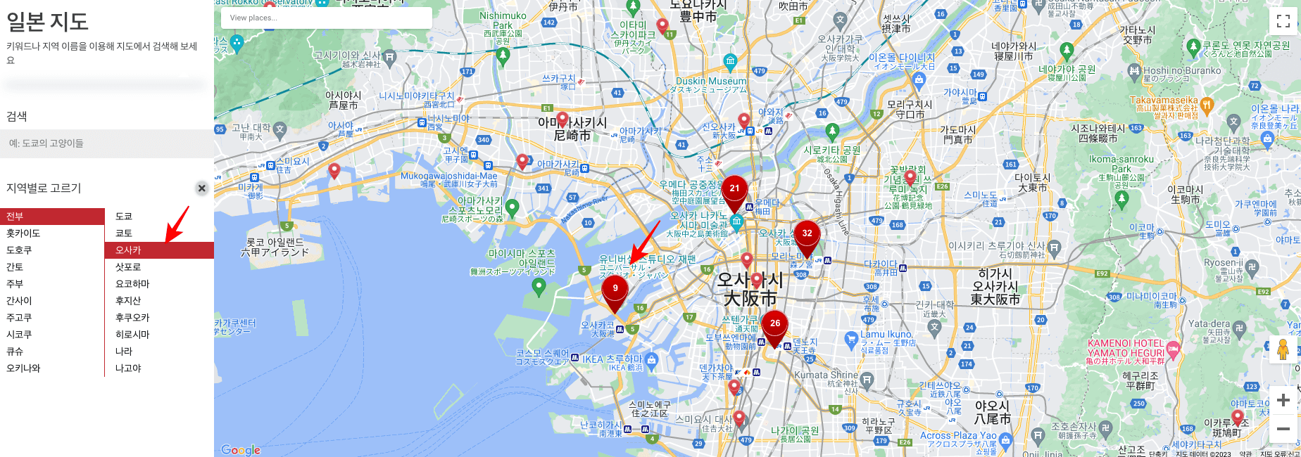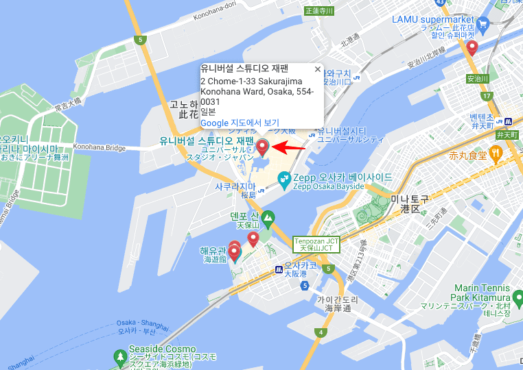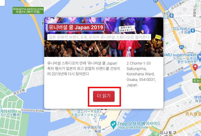 이번에는 많은 한국인들이 방문하는 오사카 관광지를 찾아보도록 하겠습니다. 우측 일본 지도에서 9번을 선택합니다. 9번은 바로 유니버설 스튜디오 재팬입니다. 지도 위에서 붉은 마크를 선택하면 연관된 기사가 표시됩니다. 유니버설 쿨에 대한 기사인데 [더 읽기]를 선택해 보겠습니다.