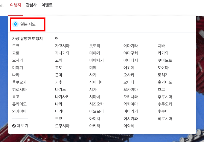 Japan Travel 홈페이지에 방문하시면 위와 같은 페이지를 확인할 수 있습니다. 상단 메인 메뉴에서 여행지로 마우스를 가져갑니다. 이후 하단에 세부 메뉴가 표시되면 [일본 지도] 메뉴를 클릭합니다.