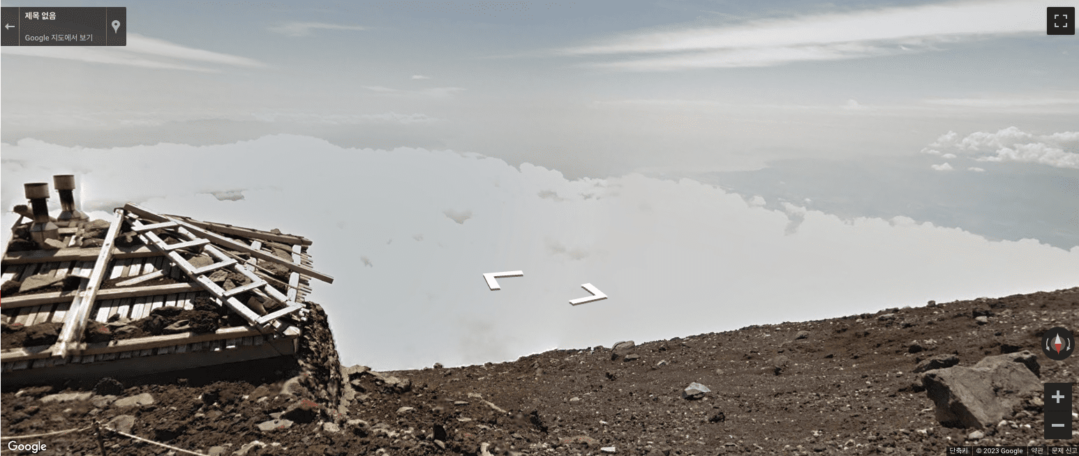 이번에는 일본에서 가장 유명한 산인 후지산을 조회해 보겠습니다. 바로 사람 아이콘을 드래그하여 후지산에 놓아보았습니다. 후지산 꼭대기에서 구름이 아래에 있는 것을 확인할 수 있습니다.