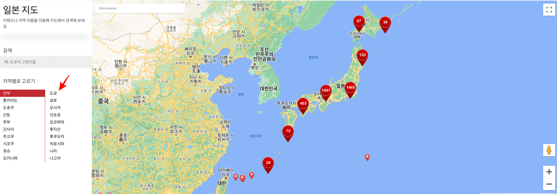 일본 지도 페이지를 확인하시면 좌측에는 지역이 표시되고 우측에는 일본 지도가 표시되는 것을 확인할 수 있습니다. 일본 지도 크게보기를 하시려면 우측 하단의 +/- 메뉴를 클릭하시면 확대 또는 축소가 가능합니다. 먼저 좌측 메뉴에서 도쿄를 선택해 보겠습니다.