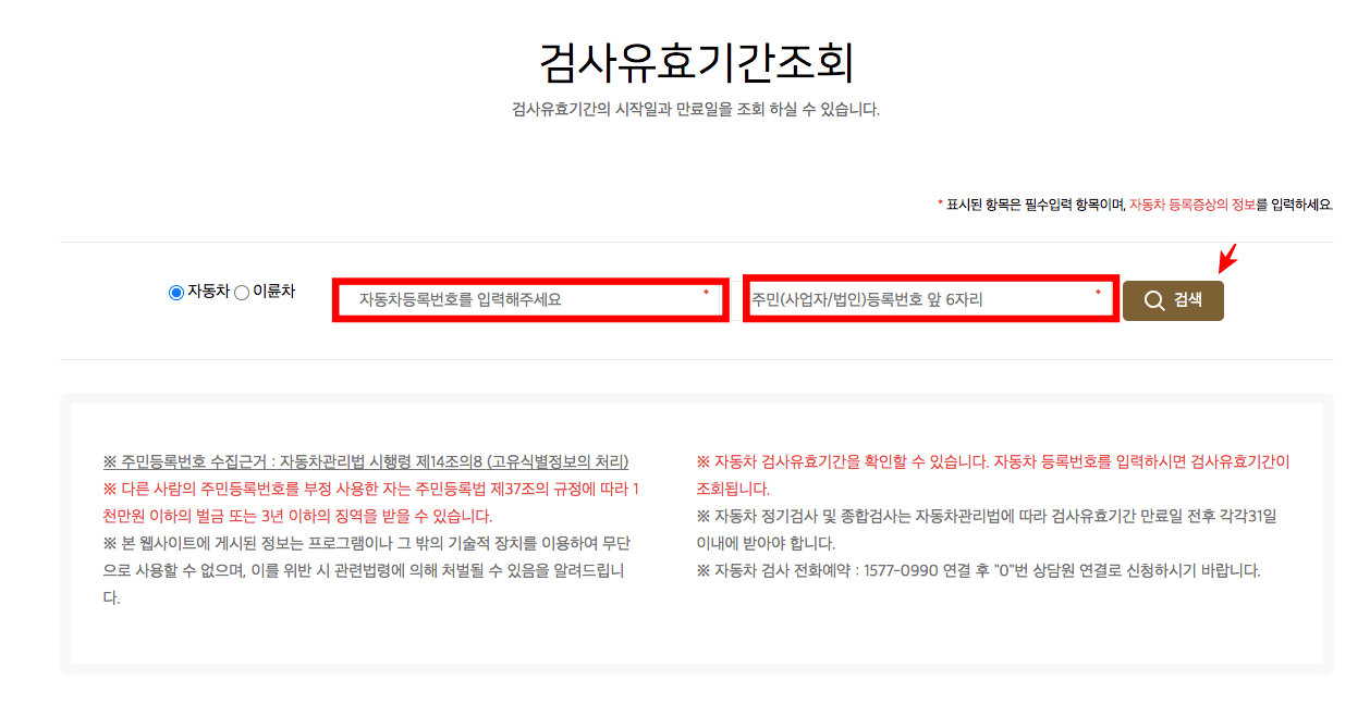 검사유효기간조회 페이지가 화면에 표시되면 자동차등록번호와 주민등록번호 앞 6자리를 입력하고 우측의 검색 버튼을 클릭하면 자동차 정기검사 조회가 됩니다. 이후 등록된 자동차의 유효기간이 화면에 표시되니 직접 확인해 보시기 바랍니다.