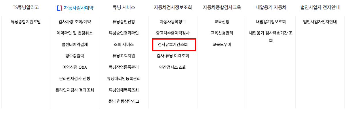 한국교통안전공단 사이버검사소 홈페이지에 방문하시면 위와 같은 메인 페이지를 확인할 수 있습니다. 상단 메인 메뉴에서 [자동차검사정보조회] 메뉴로 마우스를 가져갑니다. 세부 메뉴가 하단에 표시되면 아래에서 검사유효기간조회를 선택합니다.