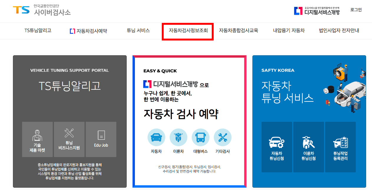 자동차를 등록하는 시점이 모두 다르기 때문에 차량의 정기검사를 조회하기 위해서는 한국교통안전공단 사이버검사소 홈페이지에 방문해야 합니다. 아래 링크를 통해 이동하시기 바랍니다.
