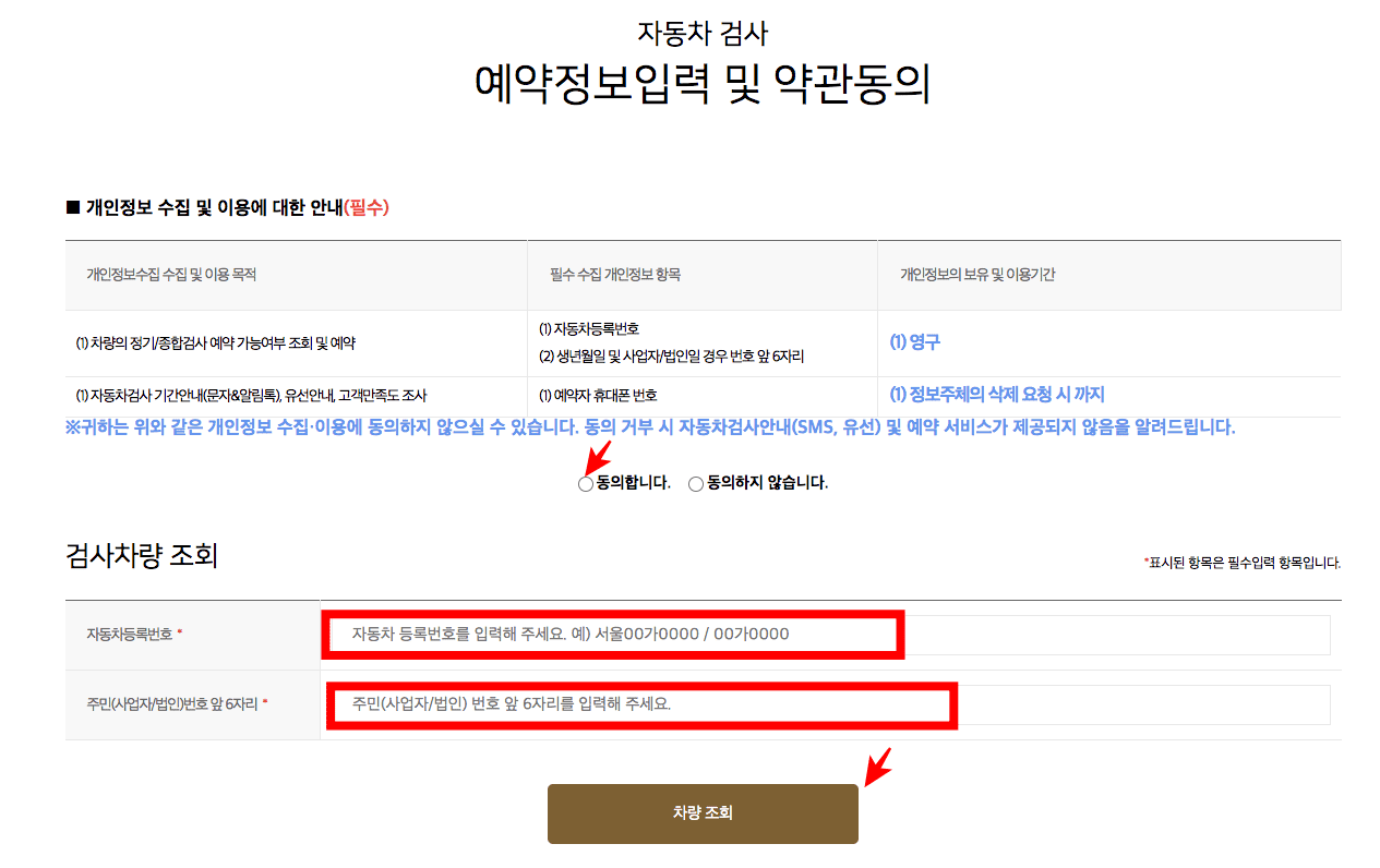 이후 자동차 검사 예약정보입력 및 약관동의에 동의합니다 체크 표시를 하시고 하단의 검사차량 조회에서 자동차 등록번호와 주민등록번호 앞 6자리 입력 후 하단의 차량조회 버튼을 클릭합니다. 이후 검사 유효기간이 화면에 표시되고 검사소와 날짜 선택 후 결제하면 자동차 정기검사 예약이 완료됩니다.