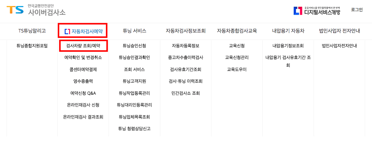 자동차 정기검사 예약 역시 마찬가지로 사이버검사소에서 진행할 수 있습니다. 메인 메뉴에서 자동차 검사 예약 > 검사차량 조회/예약 메뉴를 선택합니다. 검사예약 페이지가 표시되면 검사할 항목을 선택하고 하단의 자동차 검사 예약하기 버튼을 선택합니다.