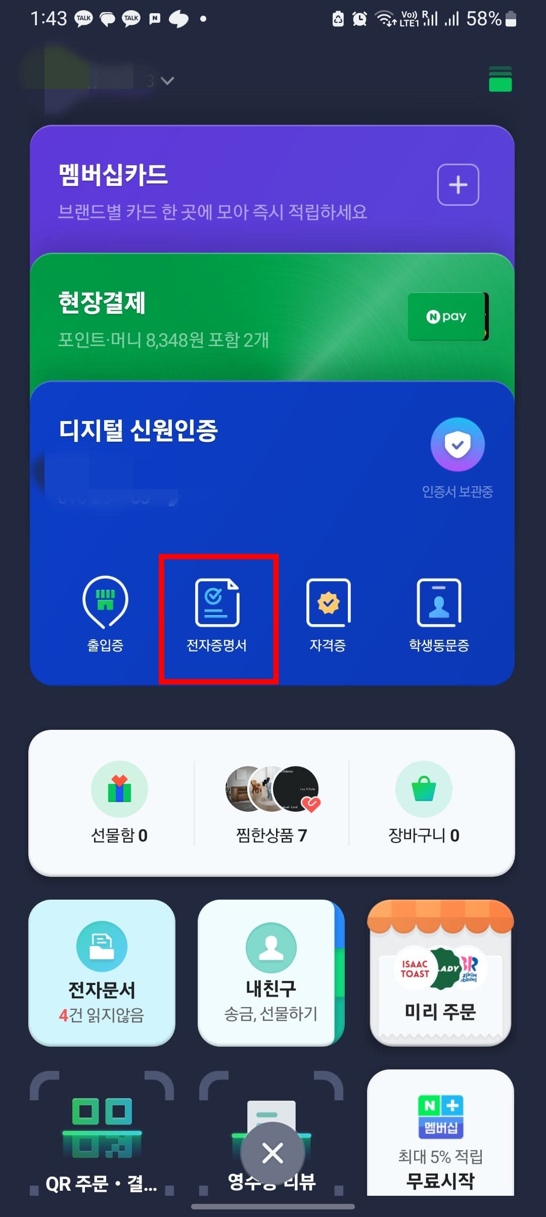 네이버 앱을 실행하고 로그인하시면 첫 화면 우측 상단에 프로필 아이콘을 터치합니다. 프로필 메뉴 내 디지털 신원인증 > 전자증명서를 터치합니다.