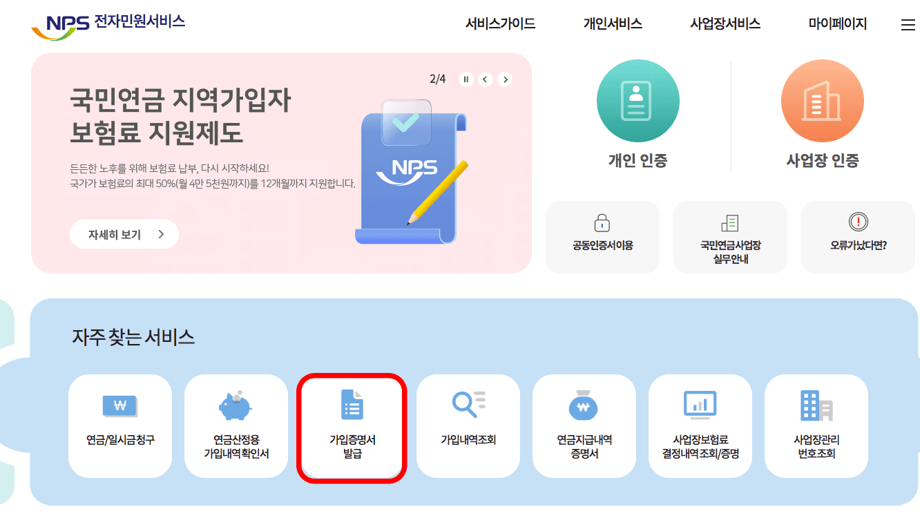 국민연금 홈페이지에 방문하시면 위와 같은 첫 페이지를 확인할 수 있습니다. 전자민원서비스를 클릭합니다. 이후 전자민원 서비스 페이지가 표시되면 자주 찾는 서비스에서 [가입증명서 발급]을 선택합니다.