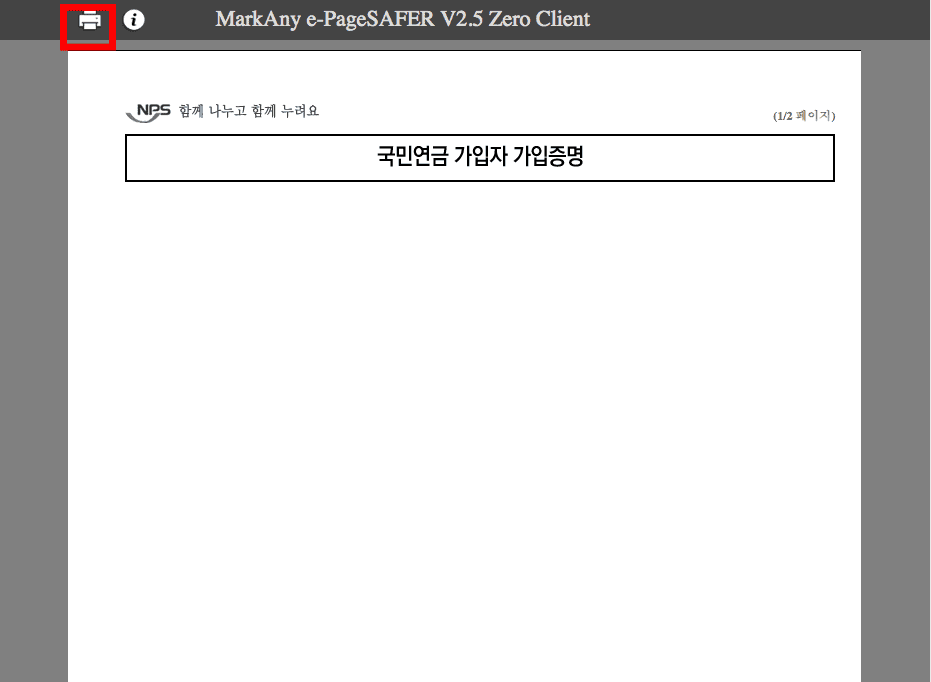 가입내역이 화면에 표시되면 우측 하단의 프린터발급을 선택합니다. 이후 가입증명서가 화면에 표시되면 좌측 상단의 프린트 아이콘을 클릭하여 재직증명서 인터넷발급을 완료합니다.