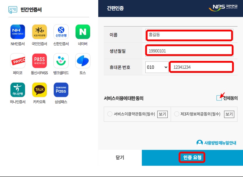 재직증명서를 발급받으려면 간편 인증, 네이버, 인증서, 카카오페이 로그인 중 보유한 인증 수단을 선택해야 합니다. 여기에서는 간편인증으로 진행해보았습니다. 간편인증 페이지가 표시되면 좌측에서 보유한 인증수단을 선택한 후 우측에서 이름, 생년월일, 휴대폰번호 입력후 하단 전체동의에 체크하고 인증요청 버튼을 클릭합니다.