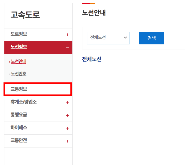 한국도로공사 홈페이지에 도착하시면 위와 같은 페이지를 확인할 수 있습니다. 상단메뉴에서 고속도로로 마우스를 가져갑니다. 하단에 세부 메뉴가 표시되면 노선정보를 클릭합니다.