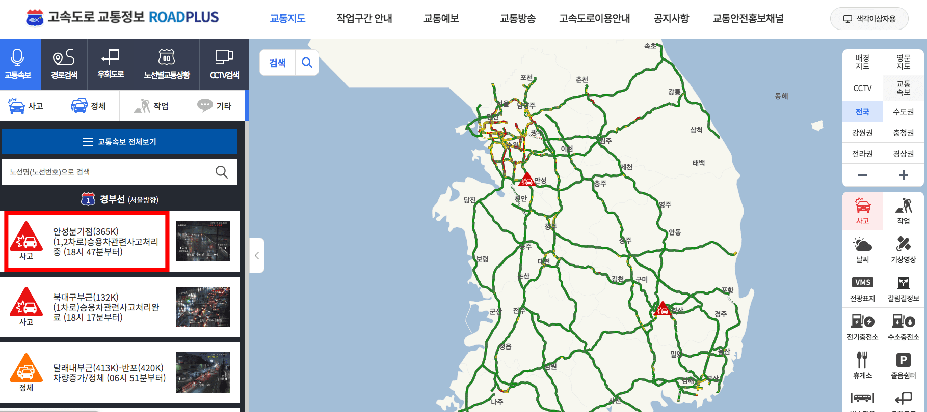 다시 홈페이지로 돌아와서 좌측 메뉴의 교통정보를 선택합니다. 교통정보는 고속도로의 실시간 교통정보를 확인할 수 있는 서비스로 사고, 작업, 날씨, 교통예보 등 다양한 소식을 실시간으로 얻을 수 있습니다. 현재 경부선에 사고가 난 것을 알 수 있습니다. 우측 지도에서 확인하시면 대략적인 사고 발생 위치를 확인할 수 있습니다.