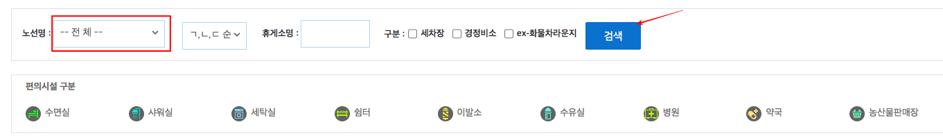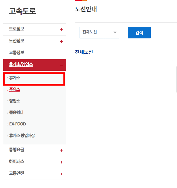 이번에는 휴게소 정보를 확인해 보겠습니다. 한국도로공사 홈페이지 좌측 메뉴에서 휴게소/영업소 > 휴게소를 클릭합니다. 노선명과 휴게소명을 우측 검색 버튼을 클릭하여 조회할 수 있습니다. 여기에서도 경부선을 선택해 보았습니다.