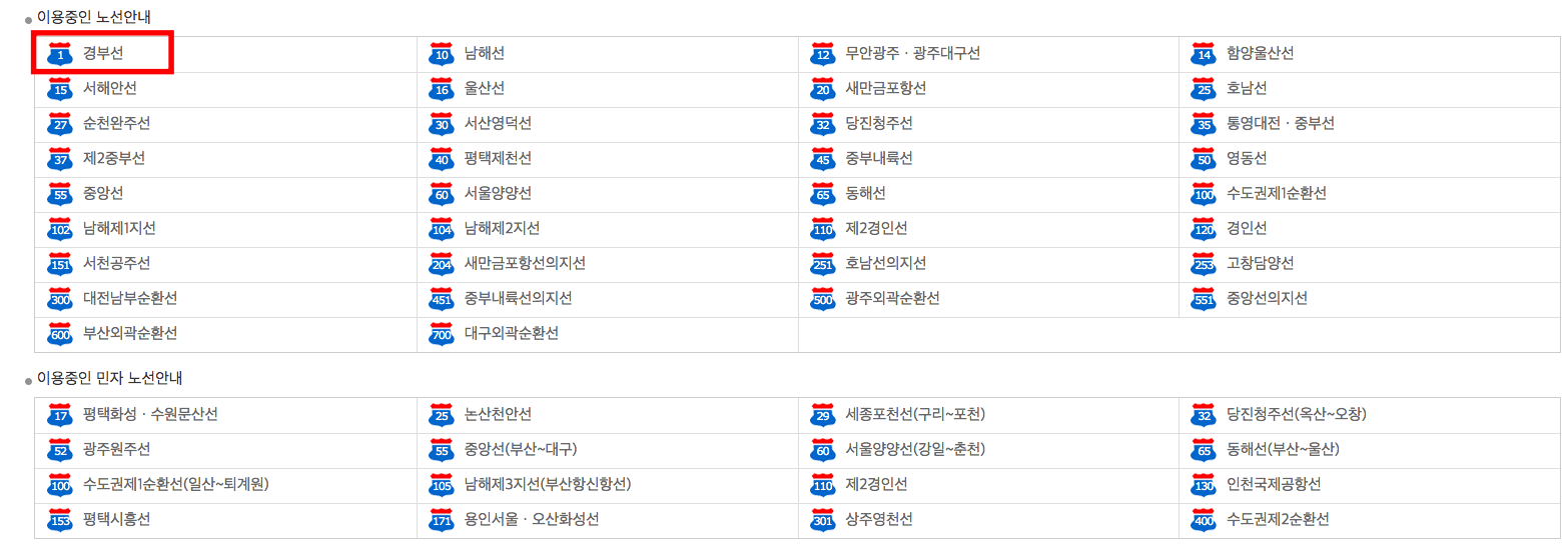 스크롤을 내려서 확인하시면 우리나라에서 이용할 수 있는 모든 고속도로 노선이 표시됩니다. 원하시는 노선을 클릭하면 해당 노선을 지도로 볼 수 있습니다. 여기에서는 경부선을 선택해 보았습니다.