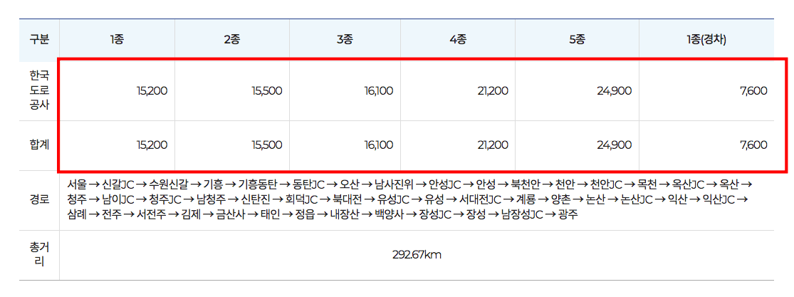 서울 > 광주까지의 고속도로 통행요금을 차종에 따라 확인할 수 있습니다.