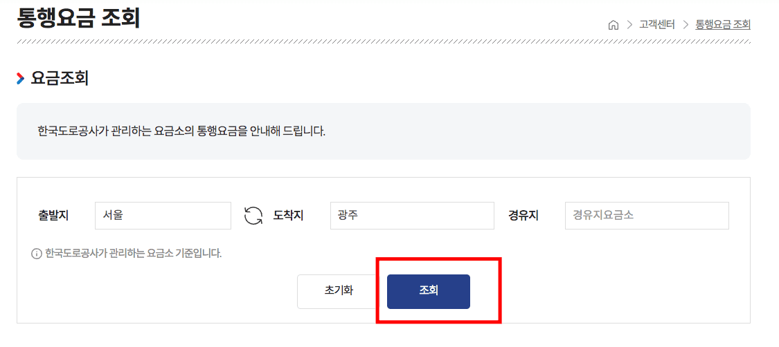 이번에는 고속도로 통행요금을 조회해 보도록 하겠습니다. 좌측 메뉴에서 통행요금 > 통행요금조회 메뉴를 클릭합니다. 요금조회 페이지에서 통행요금 조회 바로가기를 선택합니다. 이후 통행요금 조회 페이지가 표시되면 출발지와 도착지를 입력하고 하단의 조회버튼을 클릭합니다.