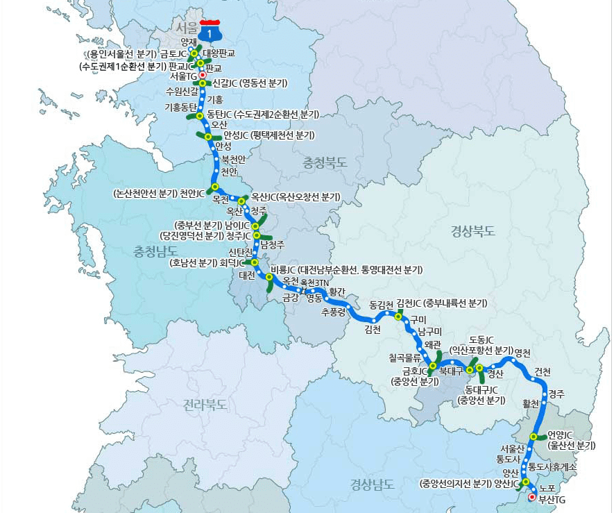 서울부터 부산까지 이어진 경부선의 노선과 분기점이 자세히 나와있는 것을 확인할 수 있습니다.