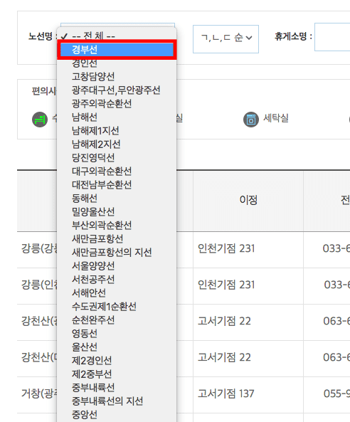 이번에는 휴게소 정보를 확인해 보겠습니다. 한국도로공사 홈페이지 좌측 메뉴에서 휴게소/영업소 > 휴게소를 클릭합니다. 노선명과 휴게소명을 우측 검색 버튼을 클릭하여 조회할 수 있습니다. 여기에서도 경부선을 선택해 보았습니다.