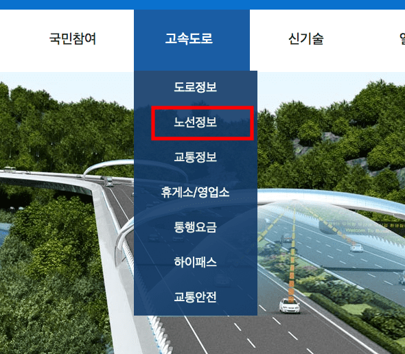 한국도로공사 홈페이지에 도착하시면 위와 같은 페이지를 확인할 수 있습니다. 상단메뉴에서 고속도로로 마우스를 가져갑니다. 하단에 세부 메뉴가 표시되면 노선정보를 클릭합니다.