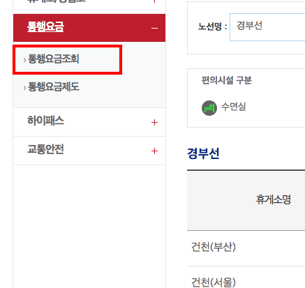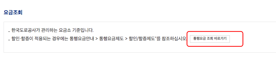 이번에는 고속도로 통행요금을 조회해 보도록 하겠습니다. 좌측 메뉴에서 통행요금 > 통행요금조회 메뉴를 클릭합니다. 요금조회 페이지에서 통행요금 조회 바로가기를 선택합니다. 이후 통행요금 조회 페이지가 표시되면 출발지와 도착지를 입력하고 하단의 조회버튼을 클릭합니다.