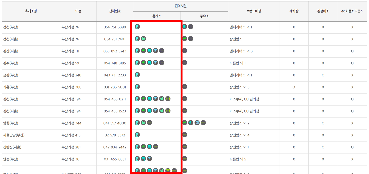 경부선에 위치한 모든 휴게소 정보를 확인할 수 있습니다. 브랜드매장, 경정비소 여부, 화물차 라운지, 전화번호 등을 확인할 수 있으며 휴게소에 있는 편의시설도 아이콘으로 확인할 수 있으니 아래 이미지를 참고하시기 바랍니다.