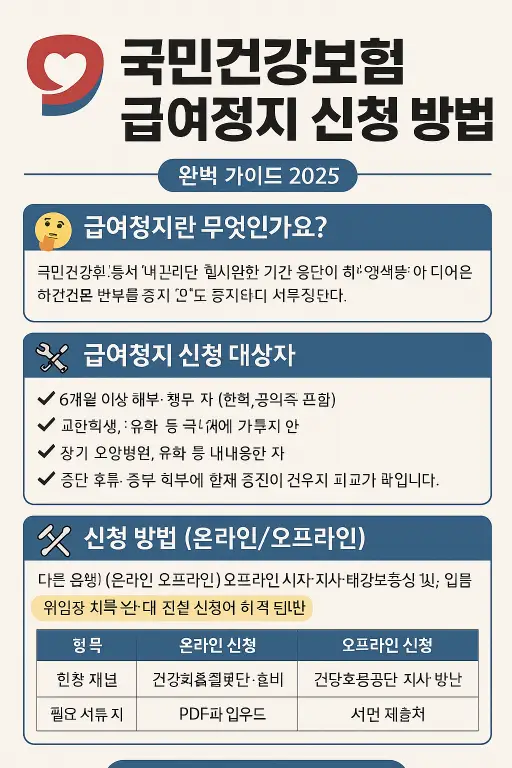 오늘은 2025년 기준으로 **국민건강보험 급여정지 신청 방법**을 아주 쉽고, 정확하게 정리해드릴게요.