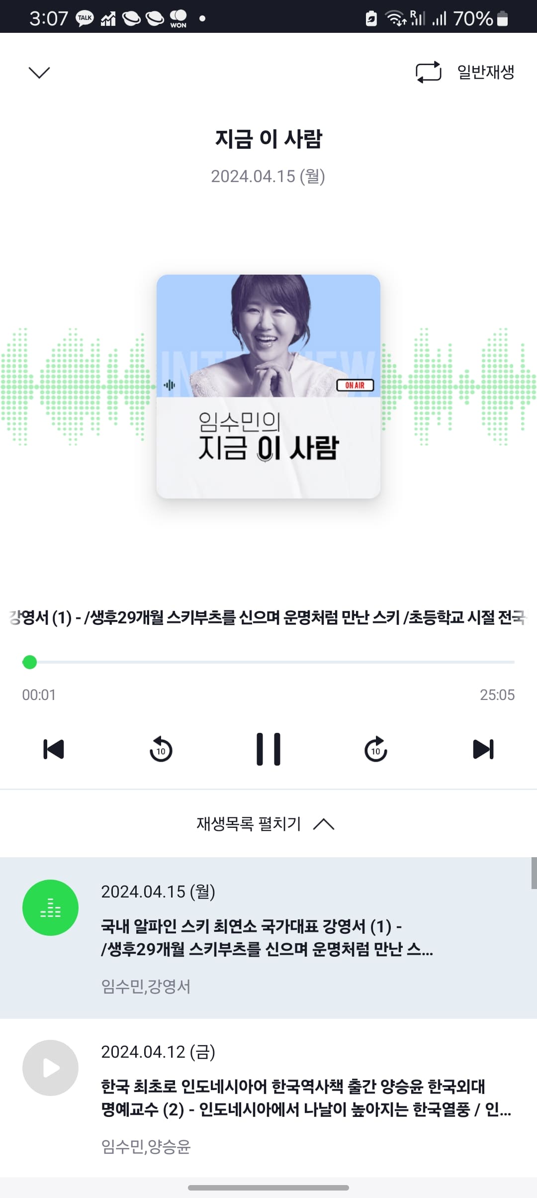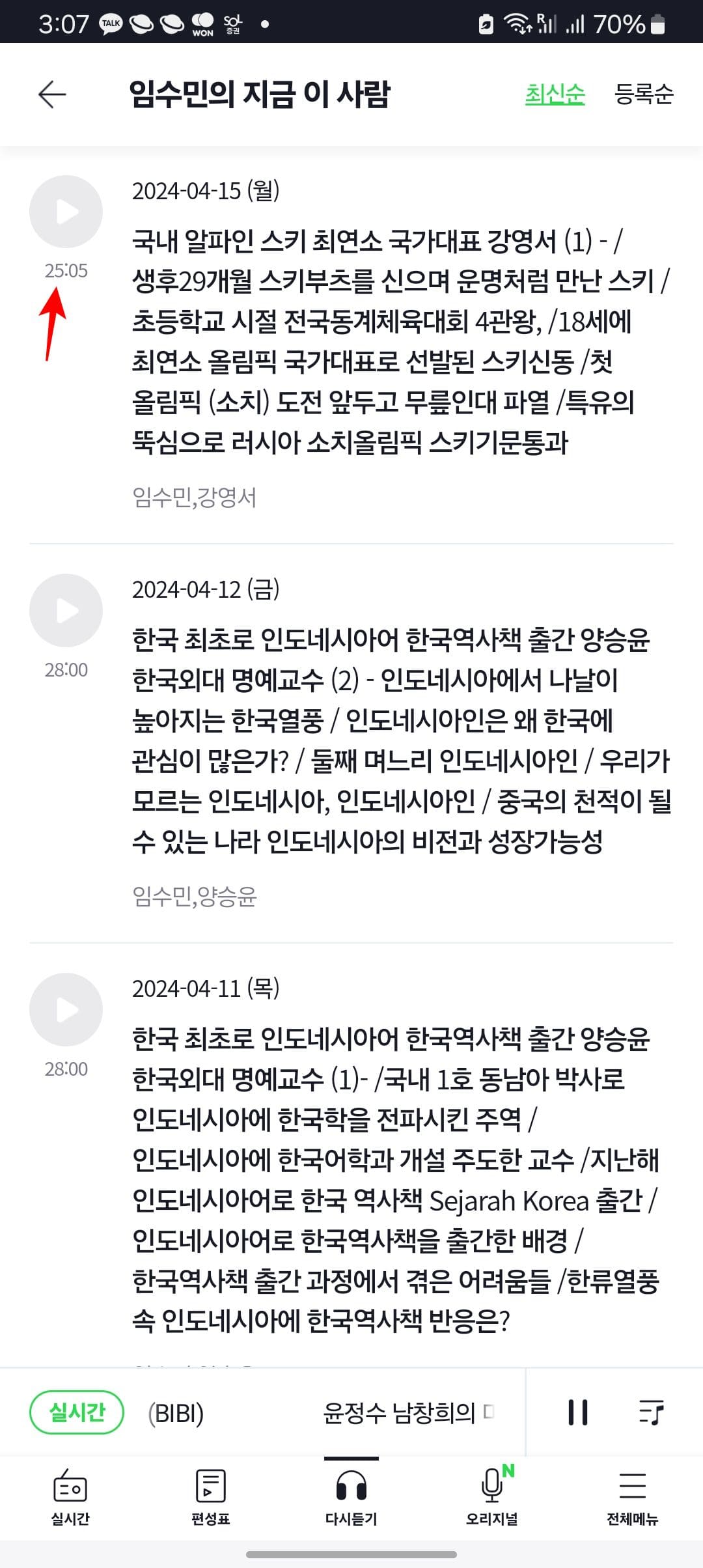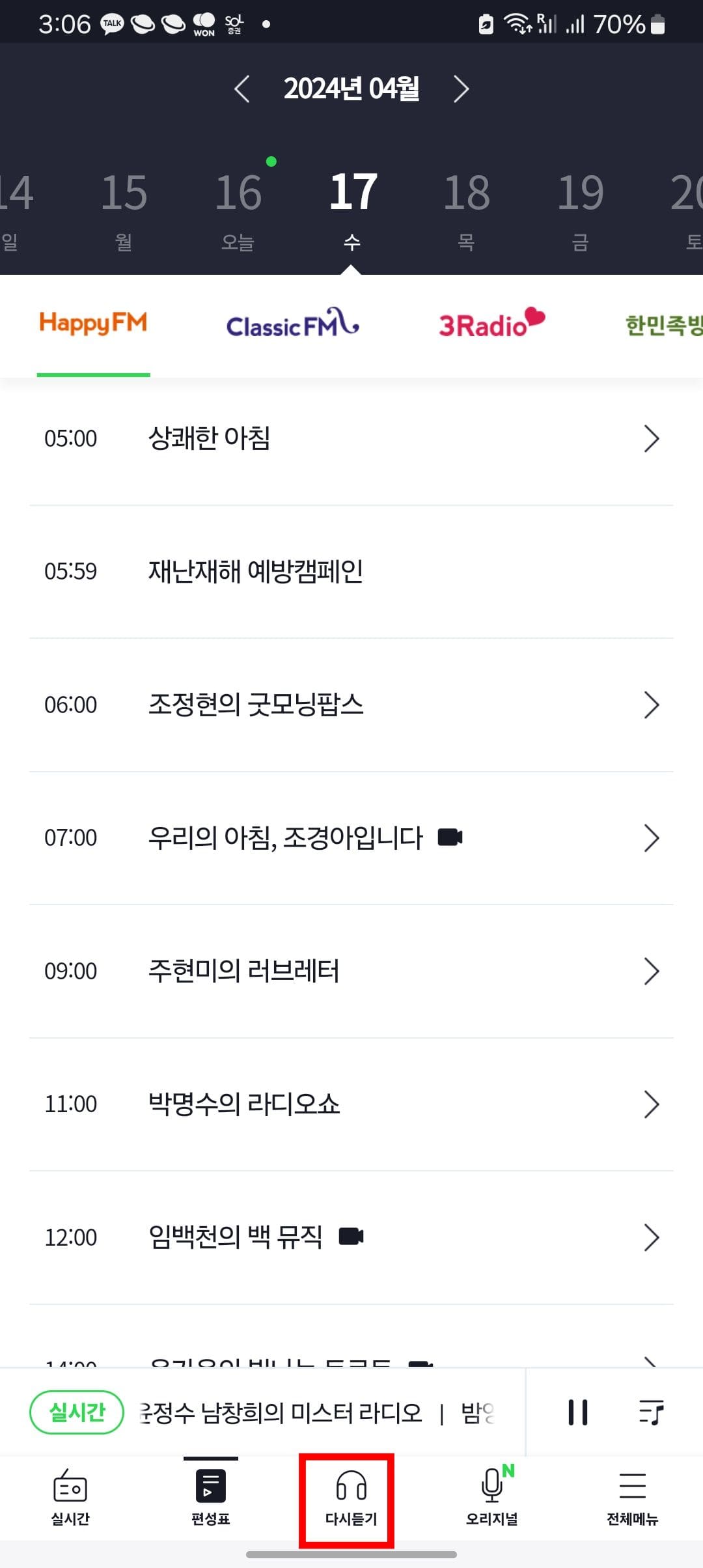 하단의 다시 듣기 메뉴를 선택하면 지난 방송을 청취할 수 있습니다. 채널을 선택하시면 요약된 내용과 재생 시간을 확인할 수 있고 터치하면 재생됩니다.