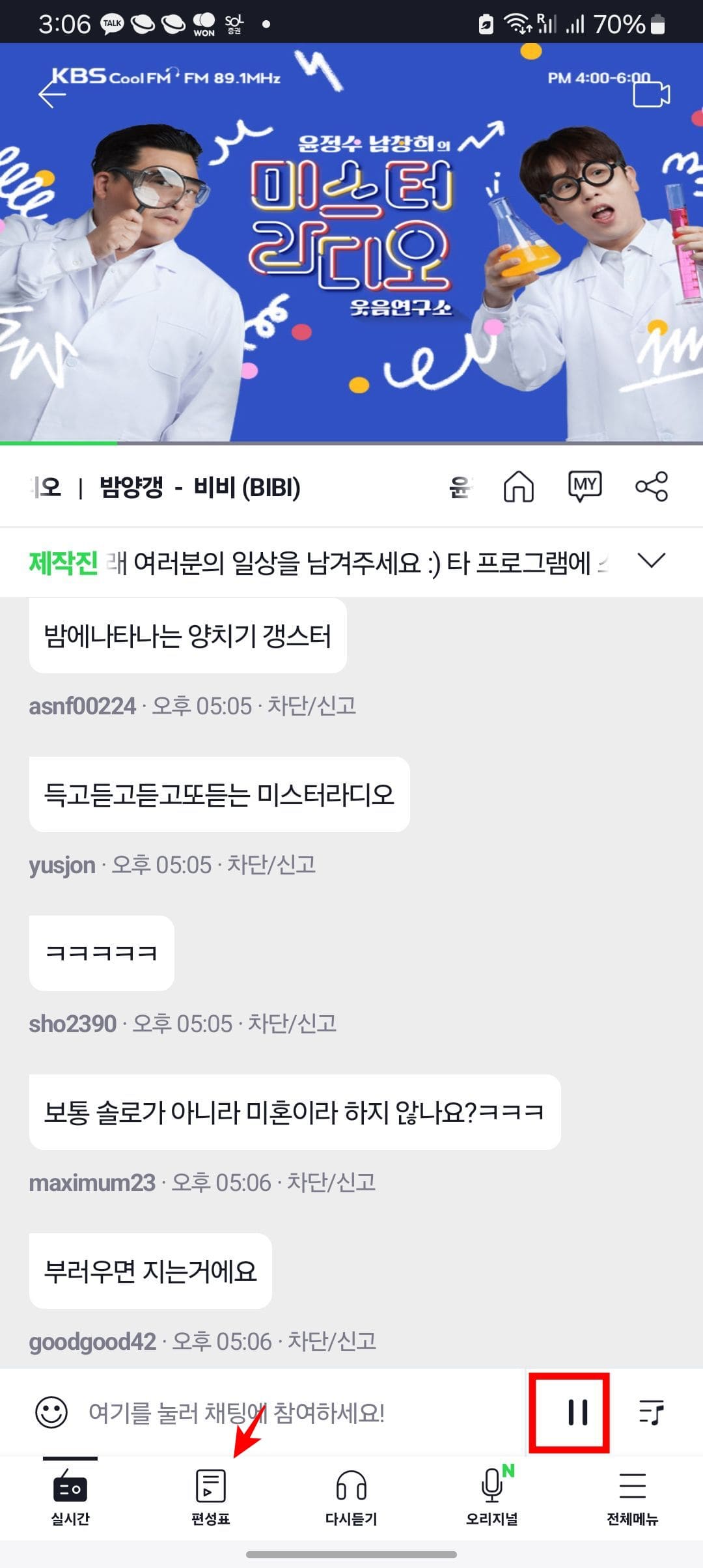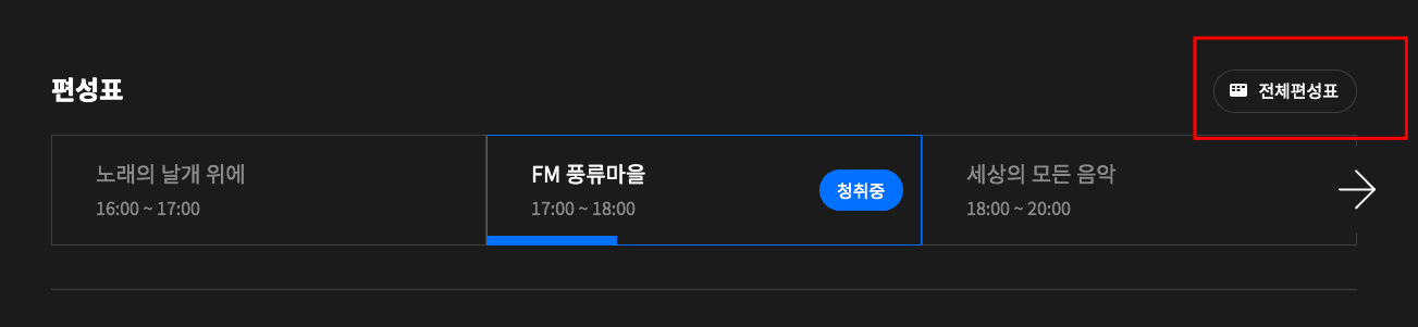 현재 실시간으로 진행 중인 채널 페이지가 표시되며 바로 청취할 수 있습니다. 편성표를 확인하시려면 스크롤을 내려 우측의 [전체편성표] 메뉴를 선택합니다.