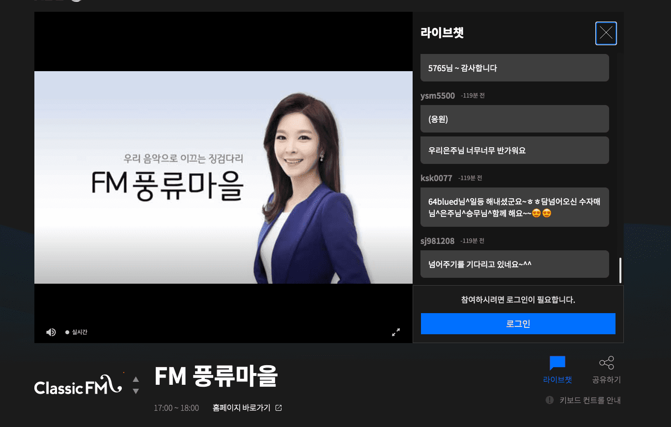 현재 재생되는 라디오 채널이 보이고 별도의 재생 버튼을 누르지 않아도 바로 청취가 가능합니다. 우측에서 라이브챗을 볼 수 있으며 방송 참여를 위해서는 우측 하단의 로그인 버튼을 클릭하여 로그인하면 됩니다.