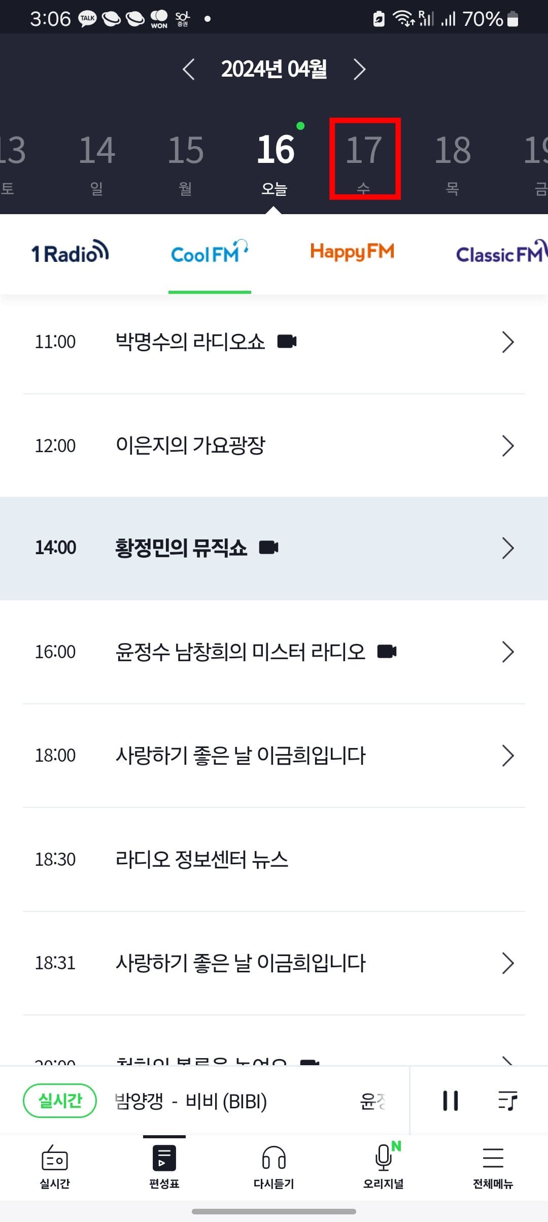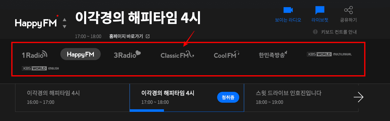 라디오 채널을 변경하려면 채널 우측의 화살표를 클릭합니다. 이후 하단에서 다양한 Kbs 라디오 채널을 확인할 수 있습니다. 클래식 FM을 선택해 보았습니다.
