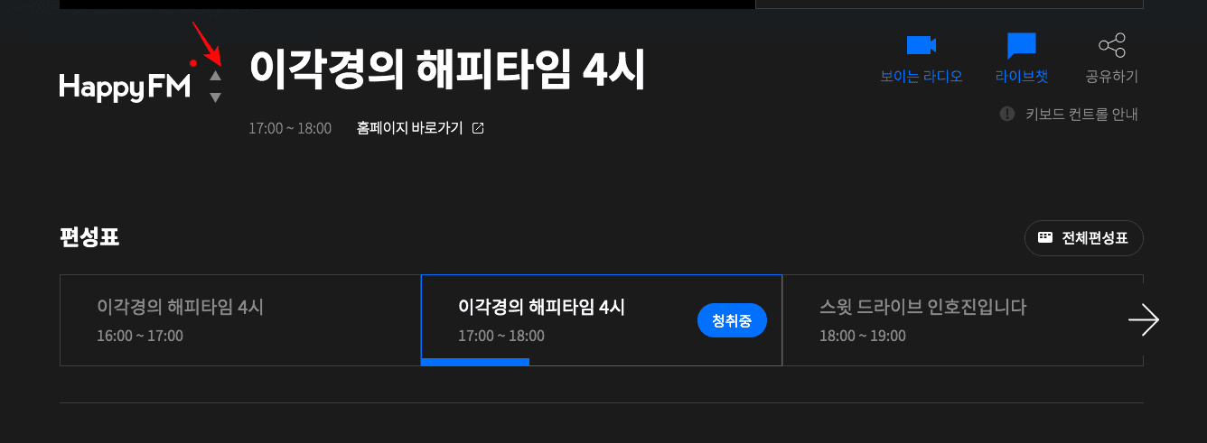 현재 실시간으로 진행 중인 채널 페이지가 표시되며 바로 청취할 수 있습니다. 편성표를 확인하시려면 스크롤을 내려 우측의 [전체편성표] 메뉴를 선택합니다.