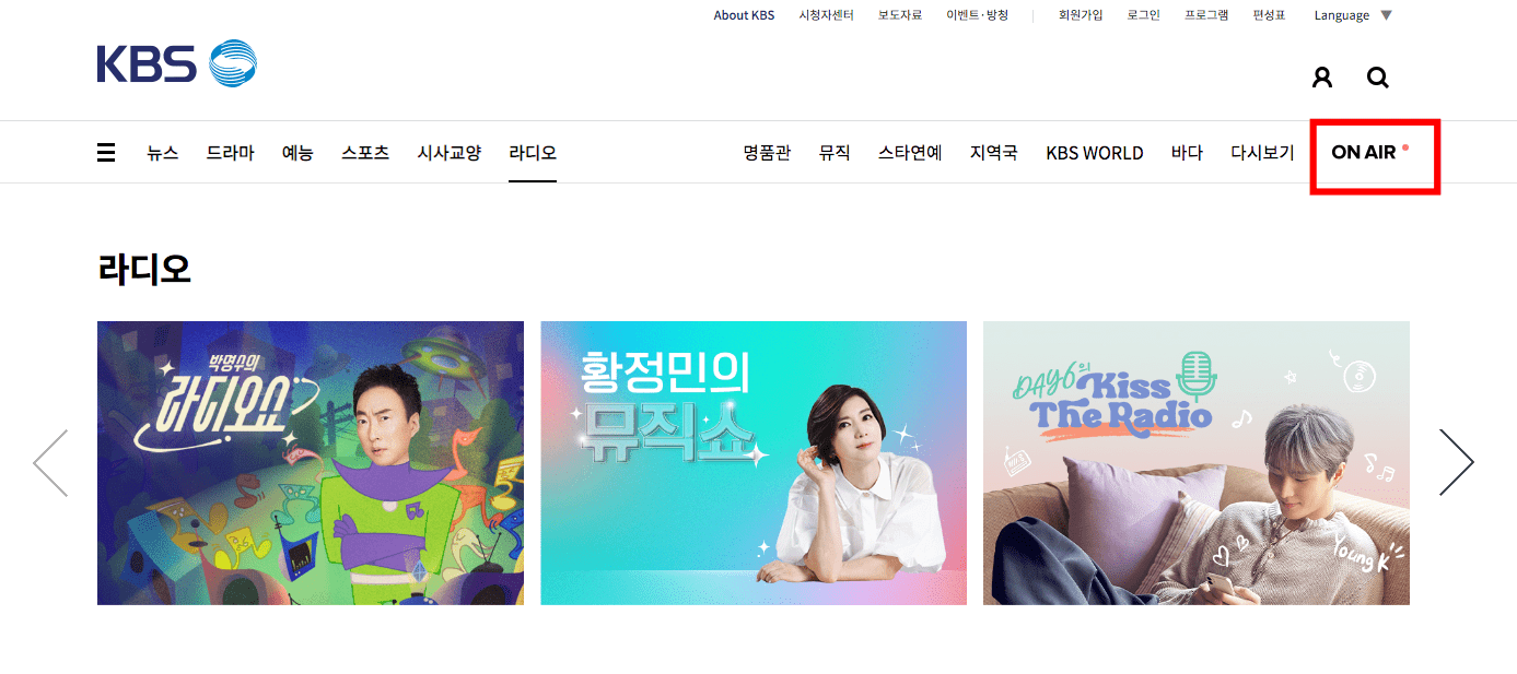 kbs 라디오 홈페이지에 도착하시면 상단 이미지와 같은 메인 페이지를 확인할 수 있습니다. 우측 상단의 [ON AIR] 메뉴를 선택합니다.