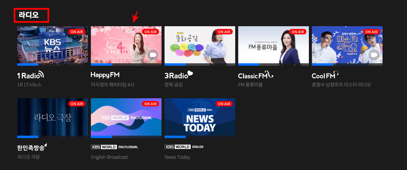 뉴스 화면이 보이게 되면 스크롤을 내려 하단으로 내려줍니다. 라디오 영역에 보이는 채널을 선택하면 24시간 실시간으로 재생되는 라디오 청취가 가능합니다. 여기에서는 Happy FM을 선택해 보았습니다.