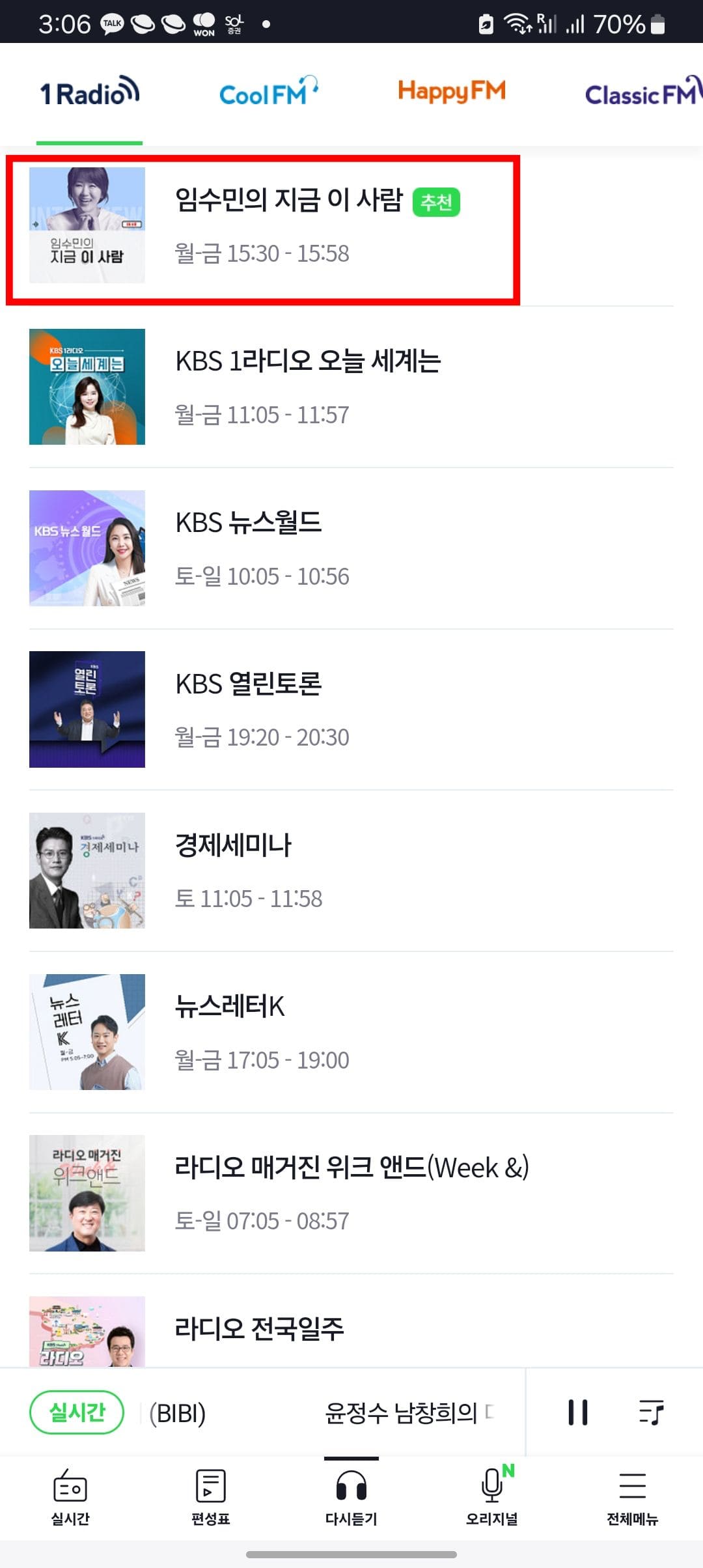 하단의 다시 듣기 메뉴를 선택하면 지난 방송을 청취할 수 있습니다. 채널을 선택하시면 요약된 내용과 재생 시간을 확인할 수 있고 터치하면 재생됩니다.