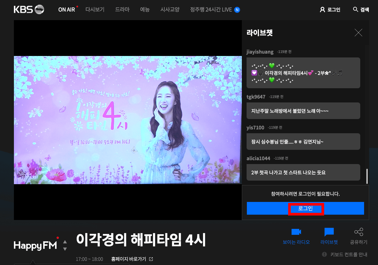 현재 재생되는 라디오 채널이 보이고 별도의 재생 버튼을 누르지 않아도 바로 청취가 가능합니다. 우측에서 라이브챗을 볼 수 있으며 방송 참여를 위해서는 우측 하단의 로그인 버튼을 클릭하여 로그인하면 됩니다.